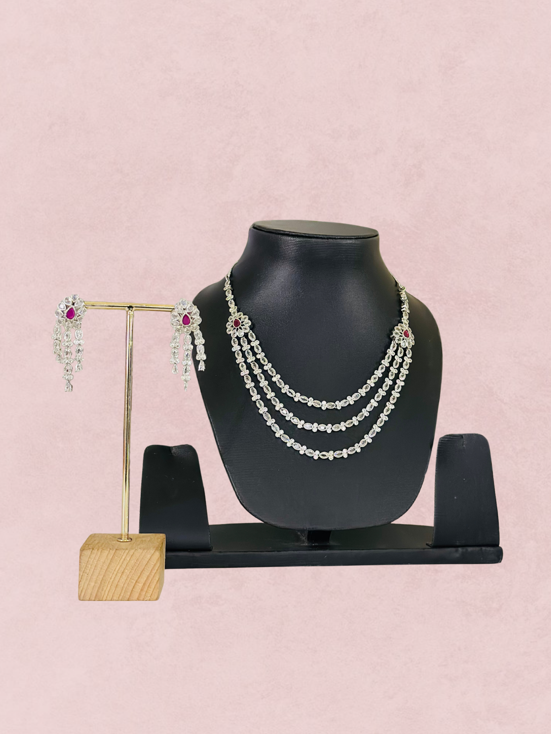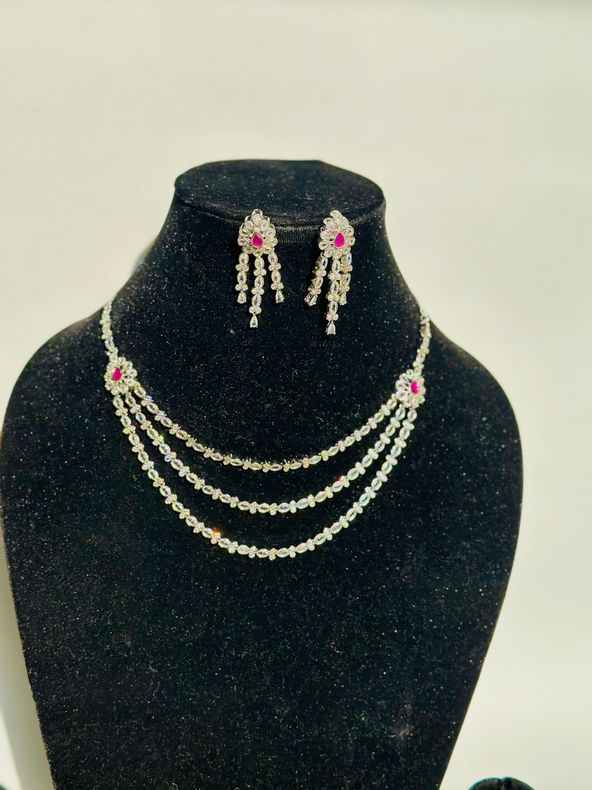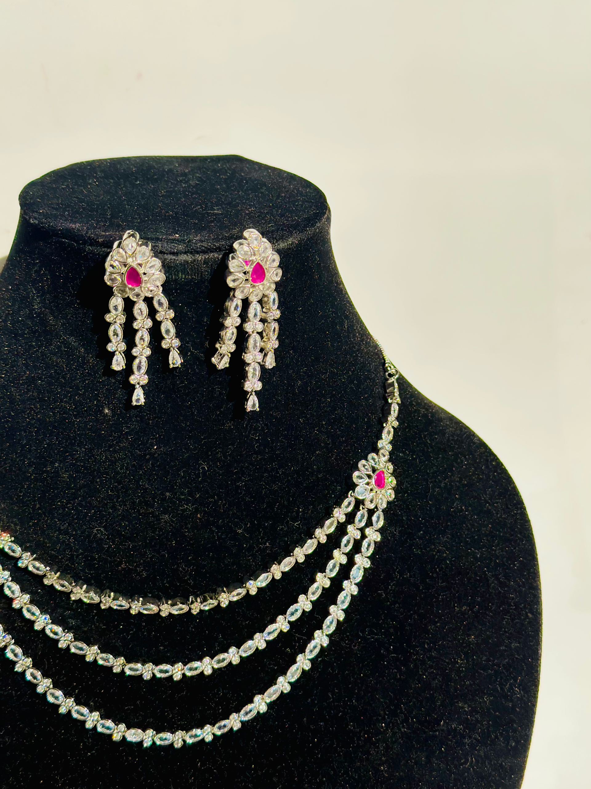 The necklace is designed with 3 layers sparkling stones that appear to be American diamonds. At the top of the necklace, where the strands connect, there are Raani Pink accent stones The earrings are a chandelier or drop-style design, featuring a similar arrangement of clear stones with a prominent Raani Pink stone at the top, mirroring the necklace’s accents.