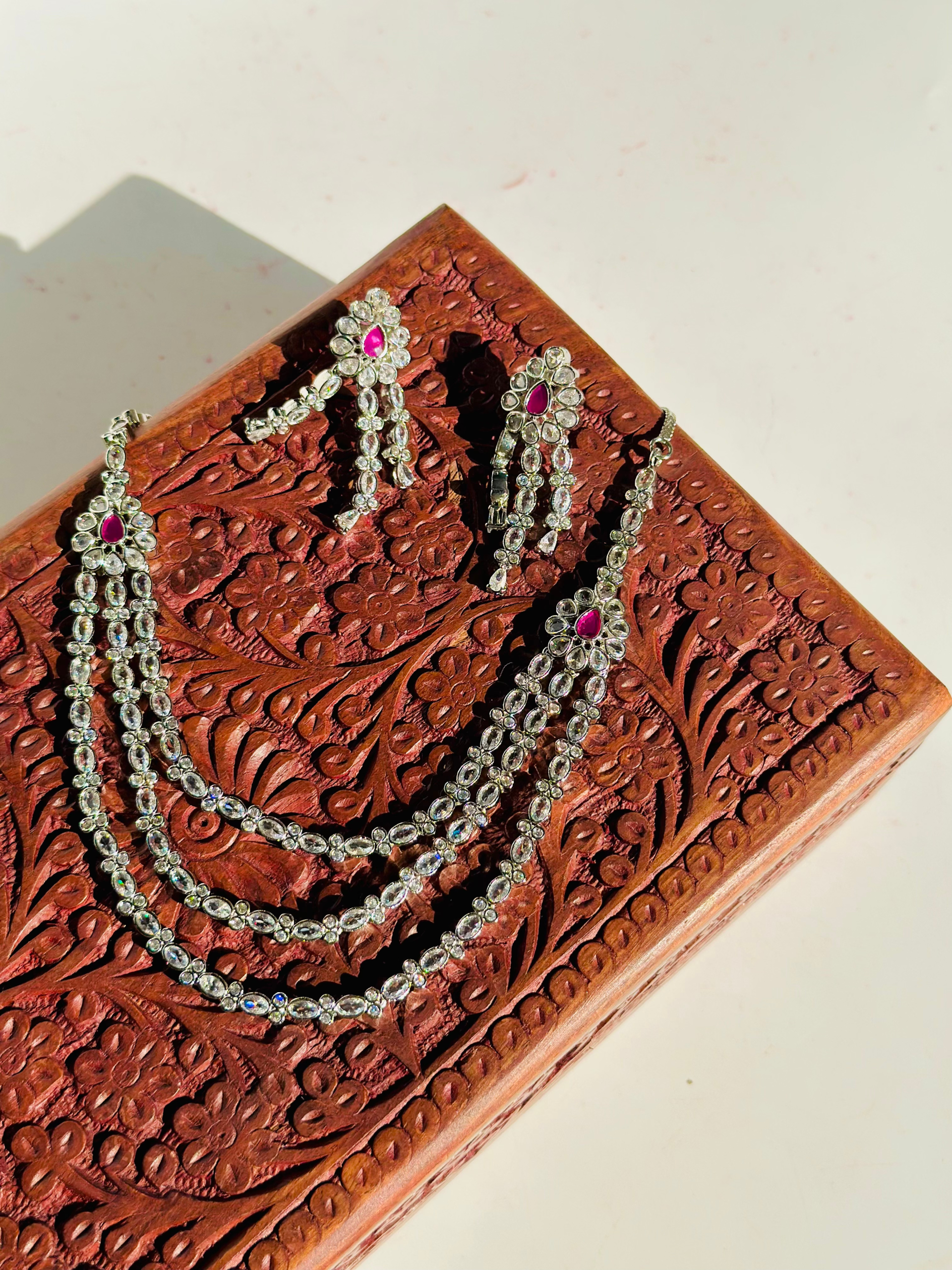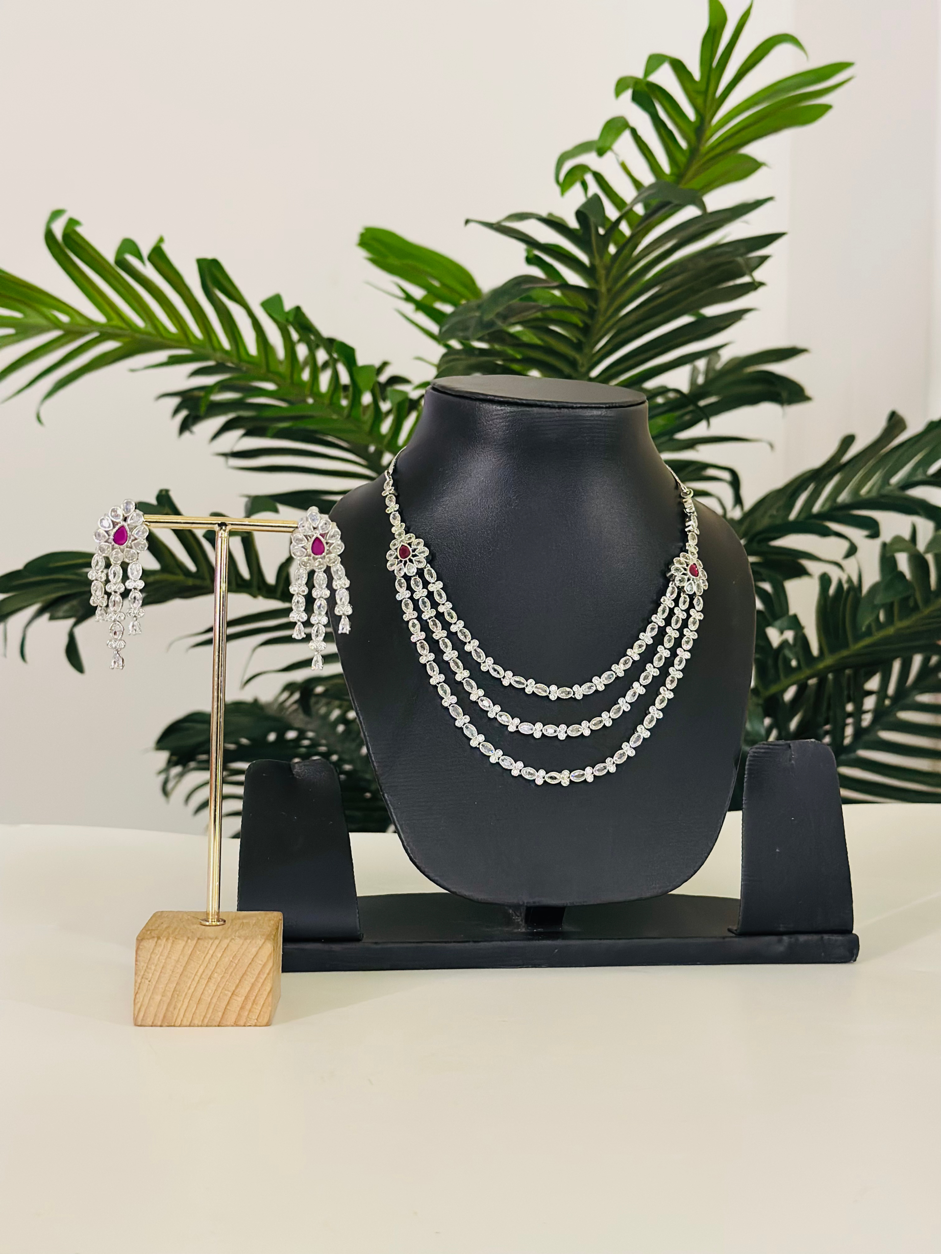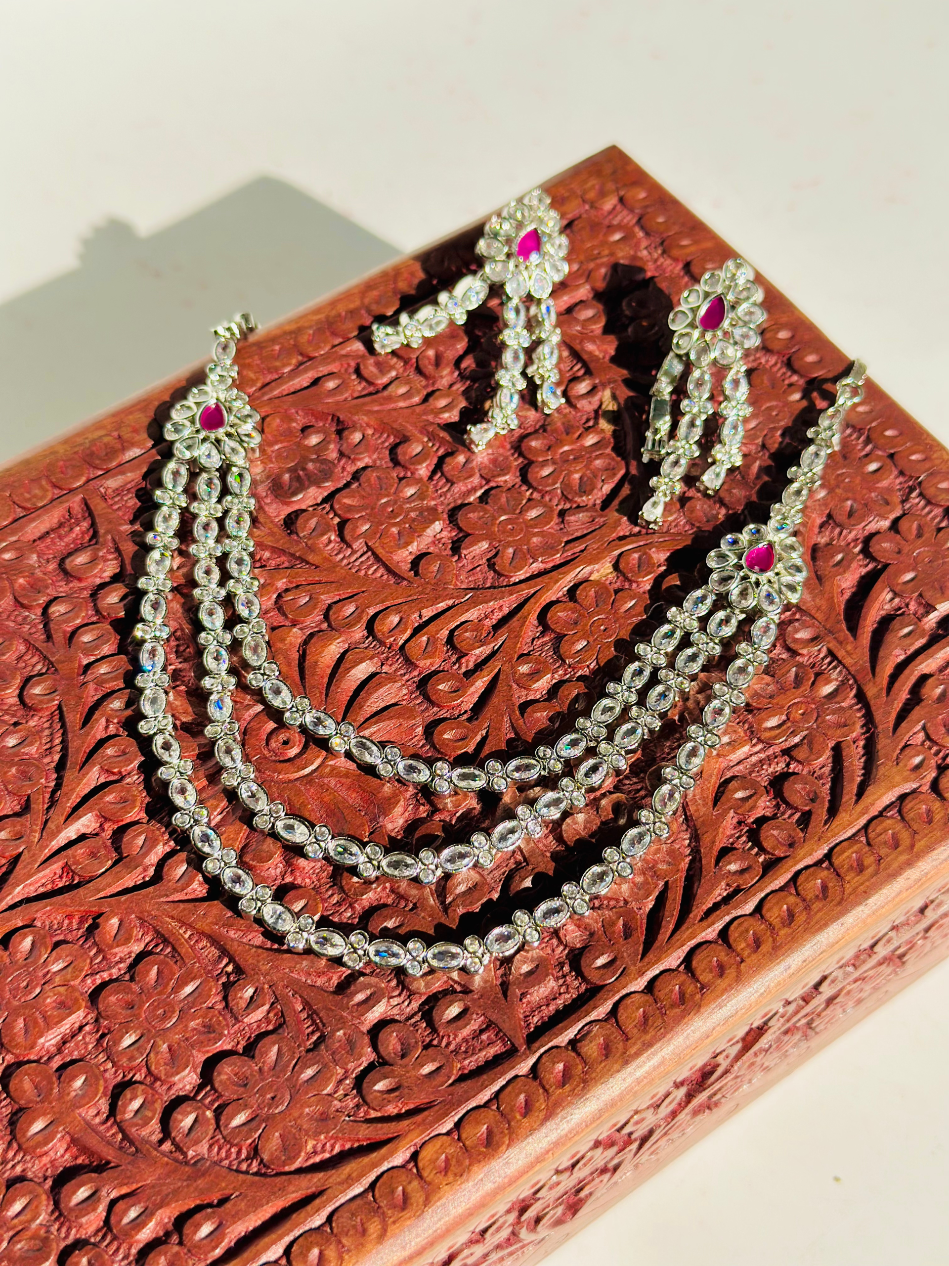 The necklace is designed with 3 layers sparkling stones that appear to be American diamonds. At the top of the necklace, where the strands connect, there are Raani Pink accent stones The earrings are a chandelier or drop-style design, featuring a similar arrangement of clear stones with a prominent Raani Pink stone at the top, mirroring the necklace’s accents.