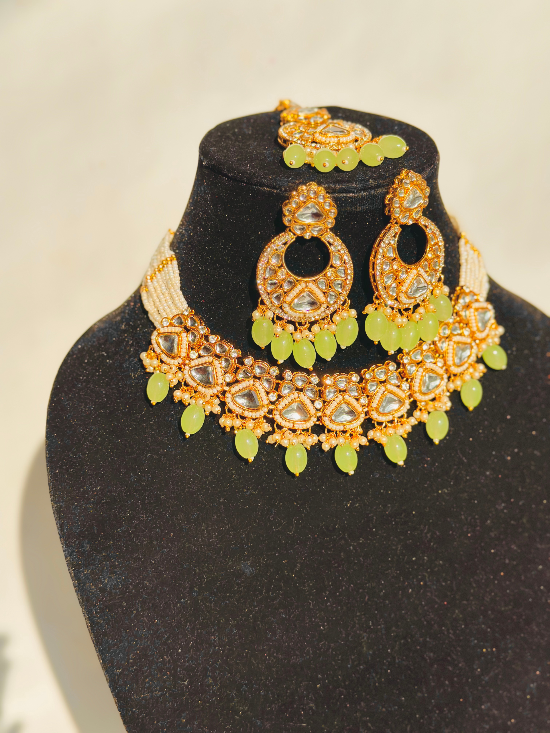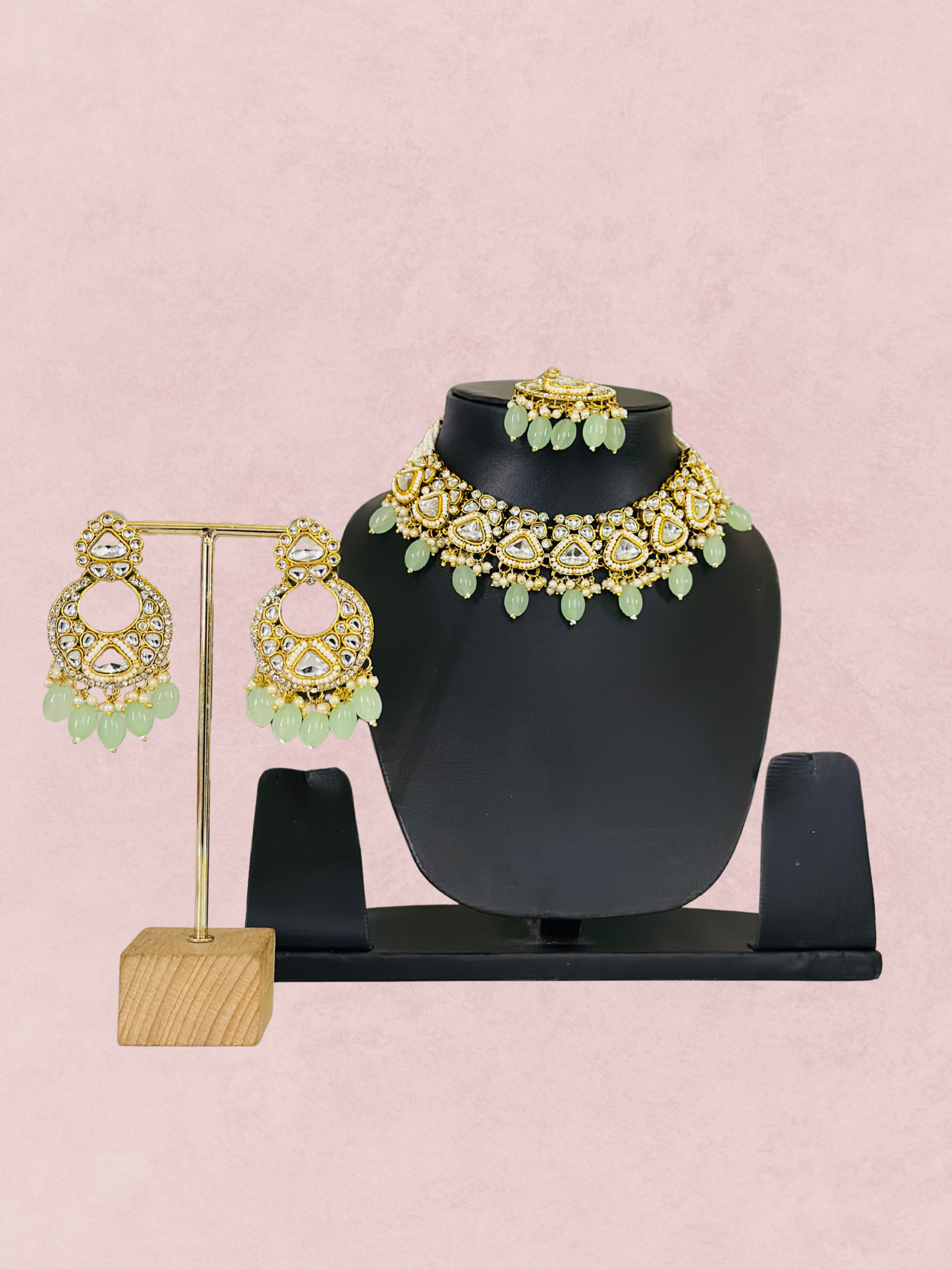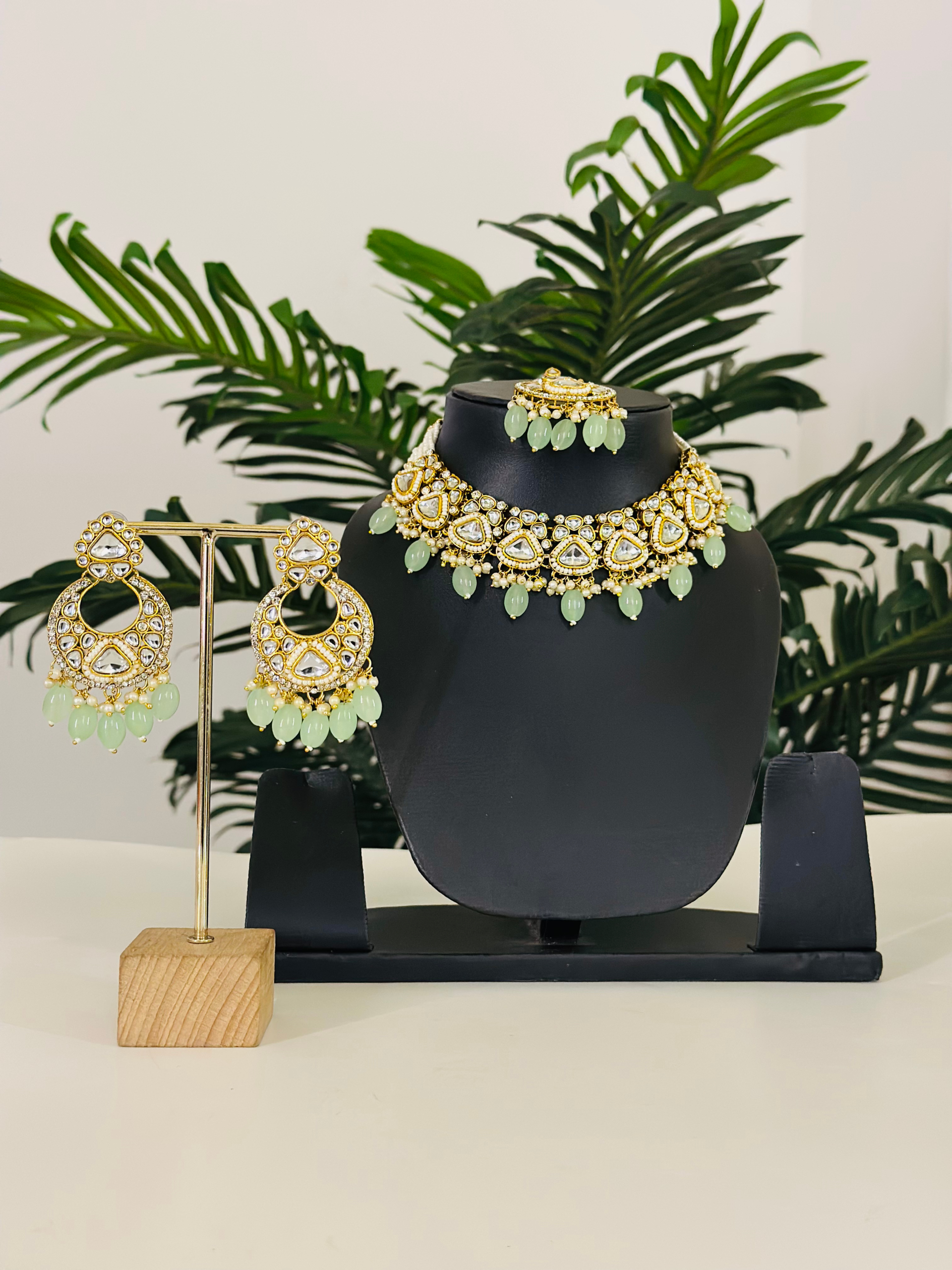 This exquisite necklace features delicate pale green stone beads that evoke the softness of a spring morning. The beads are carefully crafted to create a romantic and whimsical piece that adds a touch of elegance to any bridal look. The pale green hue is reminiscent of new beginnings and fresh starts, making it a perfect accessory .